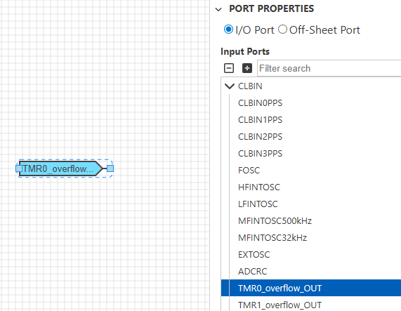 In the CLB Synthesizer GUI, configure an input port by selecting the peripheral signal to use in the Port Properties panel.
