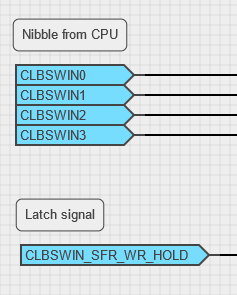 The CLBSWOUT[0..n] signals are included in the CLB Synthesizer toolchain as regular output signals. Each individual bit of the register can be driven by the CLB and read by the CPU, where it can be used as either an n-bit value or as individual bits according to needs of the application.