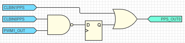 - CLBIN0PPS and PWM1_OUT are connected to inputs A and B of a LUT with the logic function O = ¬B + ¬A