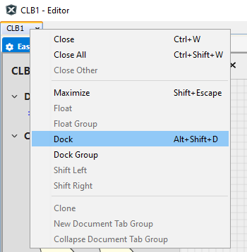To restore the layout right-click the CLB1 tab and select Dock from the menu.
