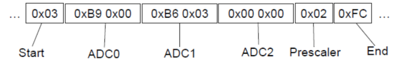 The Data Stream Format is processed in the same order as the variables specified in the Variable Streamer. All data must be given as little-endian values, meaning sending the lowest byte first. Additionally, the Data Streamer Protocol requires a start byte and an end byte which are each other's complement (~). For example, if the startByte is: 0b0000 0011, the endByte will be 0b1111 1100. This wrapper, consisting of one byte before and one byte after the data stream variables, is used by the interpreter to synchronize it to the data stream. The start byte can be arbitrary, but the end byte must be the inverse of the start byte.