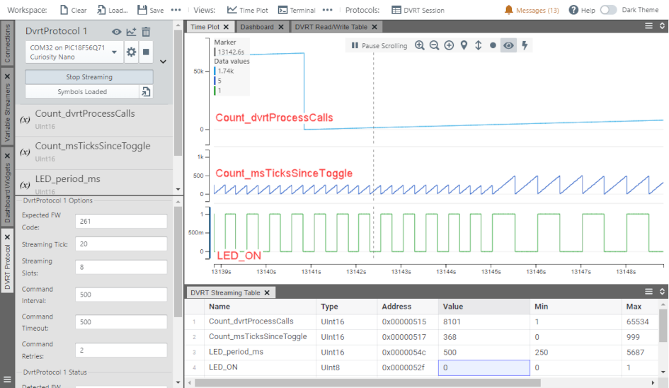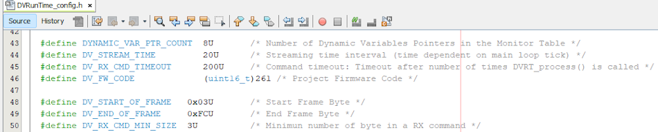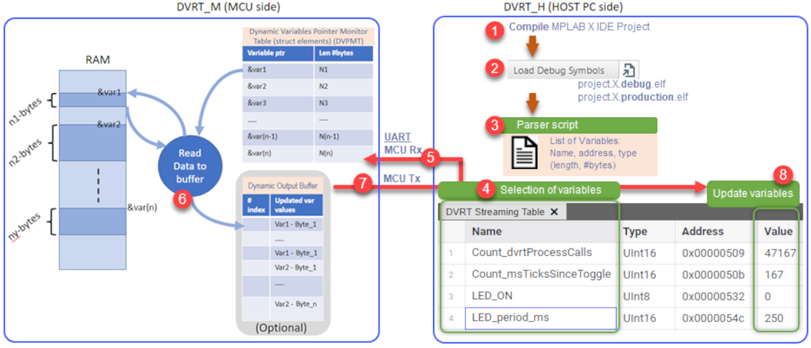 .elffile contains their name, address and type (length in bytes), i.e., at compile time, it is known where volatile variables will be located in the Microcontroller's RAM. - DVRT Streaming Table is used to select variables of interest to watch at run time.