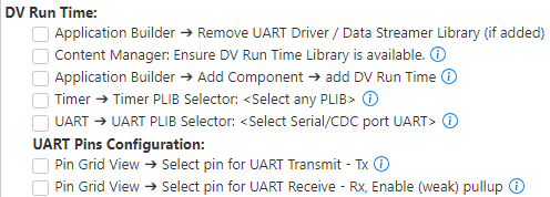 Select UART PLIB dependency: Check the schematic for the UART connected to the USB CDC UART (UART settings set by DVRT library).