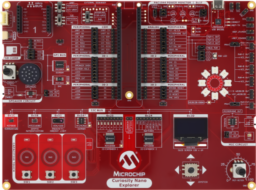 The Microchip Curiosity Nano Explorer lives up to its name by providing extensive on-board features that allow users to explore and experiment with the microcontroller peripherals of their Curiosity Nano development board. It also serves as an ideal platform to become familiar with Microchip’s software offerings, including MPLAB Code Configurator (MCC).
