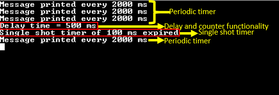 - When the single shot timer expires, a message is printed on the console that says “Single shot timer of 100 ms expired”