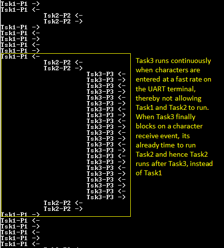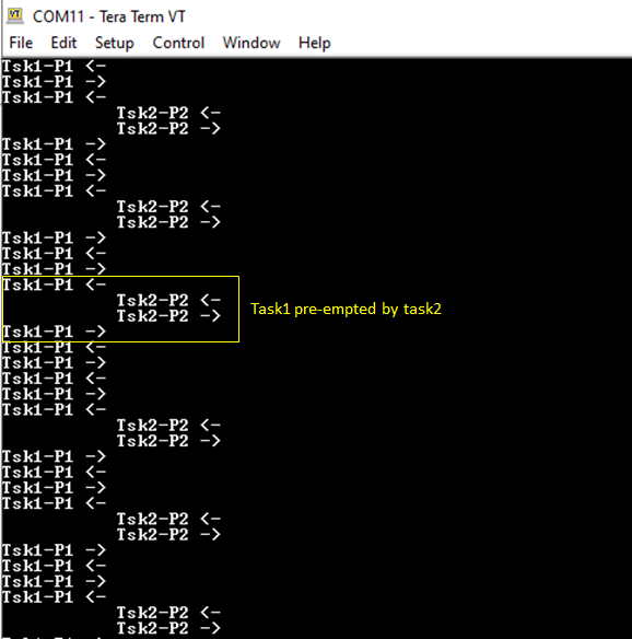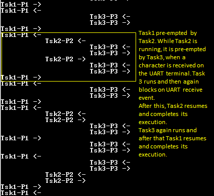 - Task1: Task1 is configured for priority 1 (lowest of all the application tasks). The task1 runs for about 100 ticks and then blocks for 10 milliseconds. Each time task1 is run, it prints a message on the UART console “Tsk1-P1 <-“ where, the <- symbol indicates that task1 is running. Just before blocking it prints another message on the UART console “Tsk1-P1 ->” where, the -> symbol indicates that task1 is about to put itself into a blocked state.