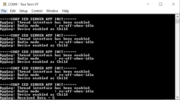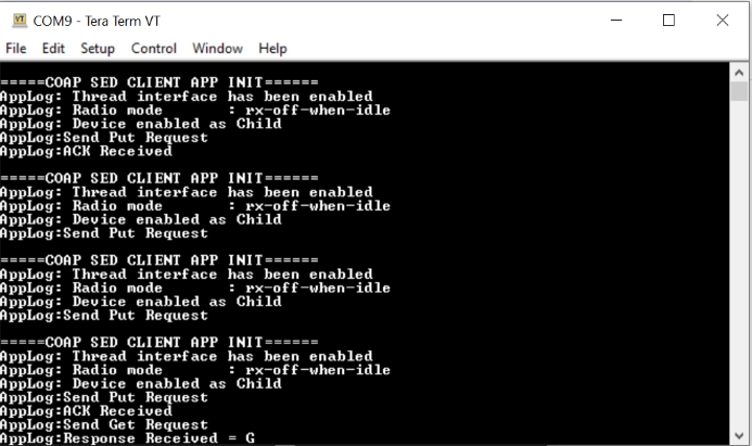This demo demonstrates the usage of the CoAP SED server. The server periodically wakes up through RTC and receives CoAP requests from the CoAP FTD client to control LED resource.