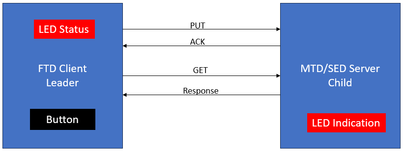 This demo demonstrates the usage of the CoAP SED client. The client wakes up periodically through RTC or via button press, sending CoAP requests to the CoAP FTD server to control LED resource.