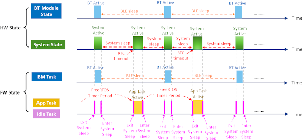 - Application layer puts the system into Deep Sleep Low Power mode and controls the wake-up time based on RTC timer (which runs in Deep Sleep Low Power mode).