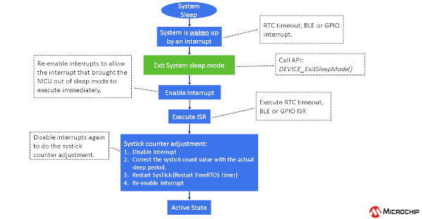 While the system is in the Sleep mode, it disables the system PLL clock and the stops system tick. The user must adjust the FreeRTOS timer to account for the duration spent in Low Power mode. The RTC timer can continue running during low power modes and corrects the FreeRTOS timer offset.