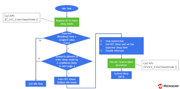 Note: The user can also add their own condition to be checked before system goes to sleep, for example, do not enter system sleep if data transmission over UART is active.Pseudo code in RTC based Tickless Idle Mode: ``` if ((BT_SYS_AllowSystemSleep()) && ( eTaskConfirmSleepModeStatus() != eAbortSleep ) && (user_condition)) { //Enter System Sleep Mode DEVICE_EnterSleepMode (); //RTC Based Tickless Idle Mode } ``` - When both the conditions as