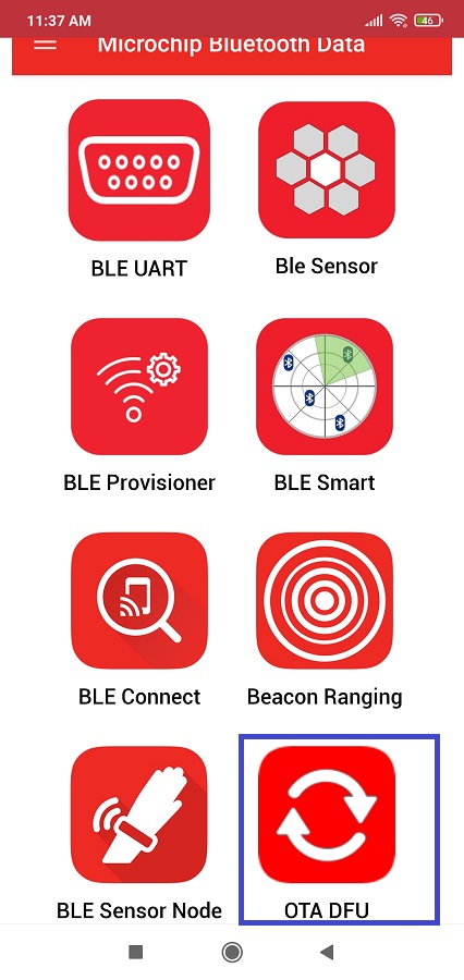 Download the .bin file that was sent over email Downloading the .bin file open the downloaded .bin file with MBD - Turn on mobile Bluetooth and select “OTA DFU" tab of Microchip Bluetooth Data