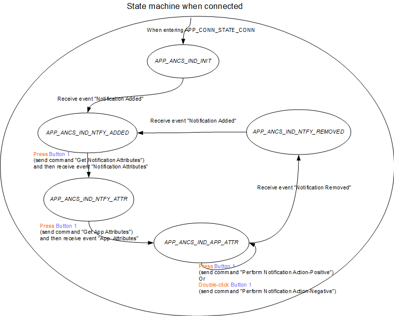 APP_ANCS_IND_INIT: The application enters this state when connected.APP_ANCS_IND_NTFY_ADDED: The application received the event "Notification Added" and is waiting for a button-pressing to send the command "Get Notification Attributes".APP_ANCS_IND_NTFY_ATTR: The application received the data related to "Notification Attributes" and is waiting for a button-pressing to send the command "Get App Attributes".APP_ANCS_IND_APP_ATTR: The application received the data related to "App Attributes" and is waiting for a button action to send the command "Perform Notification Action-Positive"/"Perform Notification Action-Negative".APP_ANCS_IND_NTFY_REMOVED: The application received the event "Notification Removed" and is waiting for another event "Notification Added".
