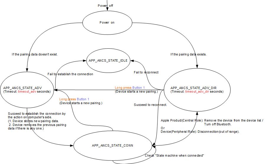 Table 5-39. Time Out Parameters Variable Value Description timeout_adv60s The timeout of advertising timeout_adv_dir30s The timeout of directed advertising Table 5-40. LED vs. State Firmware State LED behavior APP_ANCS_STATE_IDLEAll LEDs are OFF APP_ANCS_STATE_ADVBlue LED flashes one time every 3 seconds. (ON: 50 ms, OFF: 2950 ms) APP_ANCS_STATE_ADV_DIRBlue LED flashes two time every 3 seconds. (ON: 50 ms, OFF: 50 ms) APP_ANCS_STATE_CONNBlue LED flashes two times every 1.5 seconds. (ON: 50 ms, OFF: 150 ms)