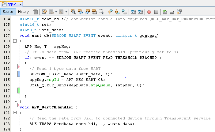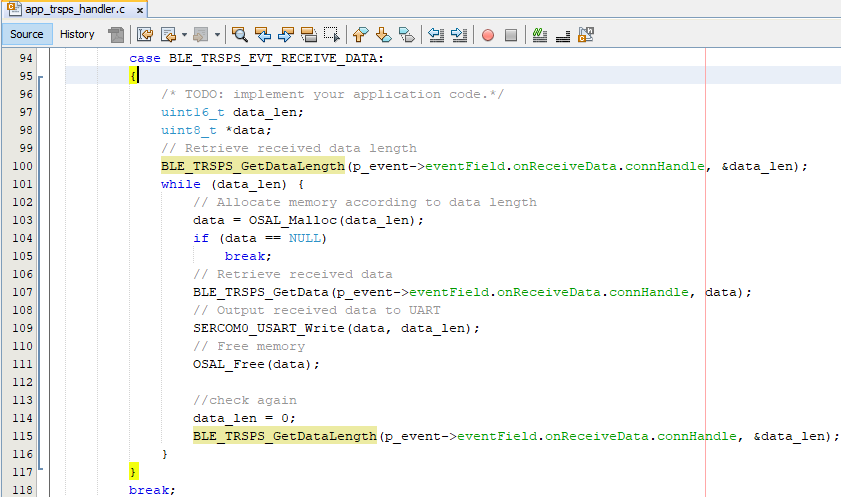 /* TODO: implement your application code.*/ uint16_t data_len; uint8_t *data; // Retrieve received data length BLE_TRSPS_GetDataLength(p_event->eventField.onReceiveData.connHandle, &data_len); while (data_len) { // Allocate memory according to data length data = OSAL_Malloc(data_len); if (data == NULL) break; // Retrieve received data BLE_TRSPS_GetData(p_event->eventField.onReceiveData.connHandle, data); // Output received data to UART SERCOM0_USART_Write(data, data_len); // Free memory OSAL_Free(data); //check again data_len = 0; BLE_TRSPS_GetDataLength(p_event->eventField.onReceiveData.connHandle, &data_len); }