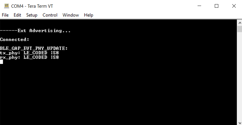 Upon programming the application, the PIC32-BZ6 Curiosity board will start Connectable Extended Advertisements with LE Coded PHY. Another PIC32-BZ6 board as a central device scanning for these advertisements will connect to the device. After a connection has been established, data can be sent back and forth over UART between the two devices. Demo will print “Ext Advertising…” indicating the start of advertisements on a terminal emulator like Tera Term. Application data to be sent to the connected central device should also be entered in the terminal emulator.