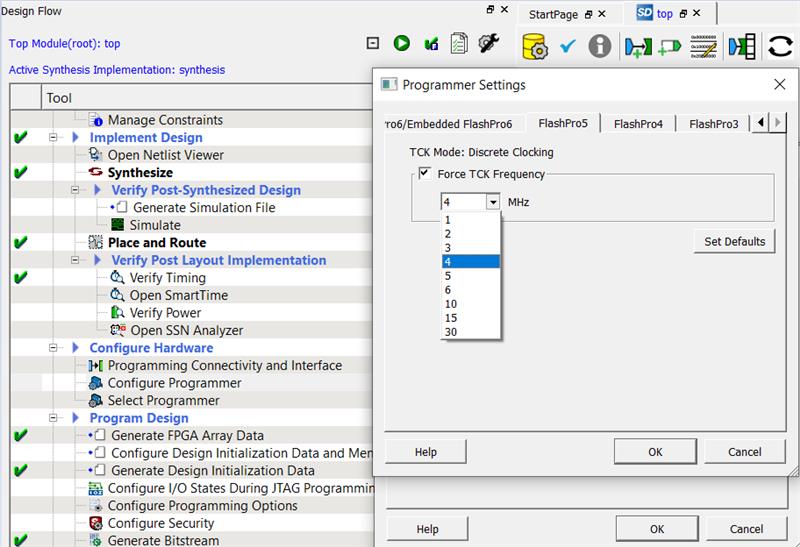 - Go to Design Flow > Configure Hardware > Configure Programmer > right-click and select Programmer Settings in the FlashPro tabs. User can modify the TCK frequency by checking and selecting the Force TCK Frequency to enhance the SPI flash programming time.