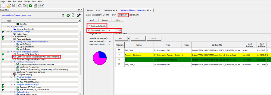- Go to Design Flow > Program and Debug Design > Configure Design Initialization Data and Memories, and select the SPI Flash tab, as shown in following figure.