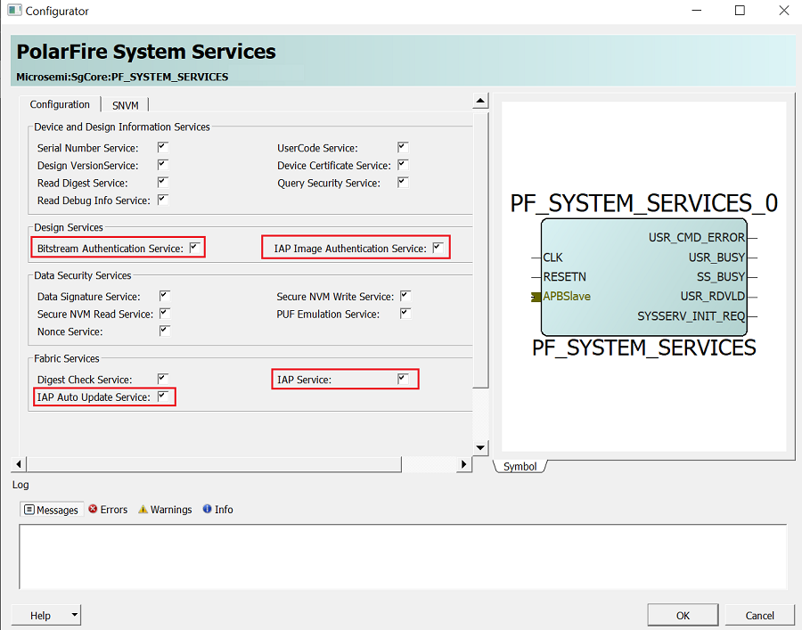 The fabric master is connected to the PF_SYSTEM_SERVICES core using the APB interface. The PF_SYSTEM_SERVICES core can be configured using the PolarFire System Services configurator in Libero SoC, as shown in Figure 4-10. For more information, see UG0848: PolarFire System Services User Guide.