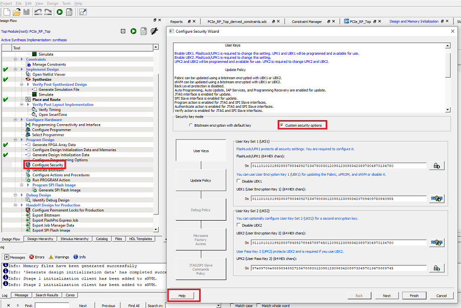 If Back Level protection is enabled, the Back Level version must be lower than the version of the design being programmed. For more information about the fields, click Help. The back-level version value restricts the design version that the device accepts as an update. Only (new) programming bitstreams with a Design Version strictly greater than the current Back Level Version previously stored in the device are allowed for programming. Back-level protection is secured by FlashLock/UPK1, which can be bypassed. The back level version and design version can be modified in the configure programming options tool. For more information about sNVM and security settings, see PolarFire FPGA and PolarFire SoC FPGA Security User Guide.