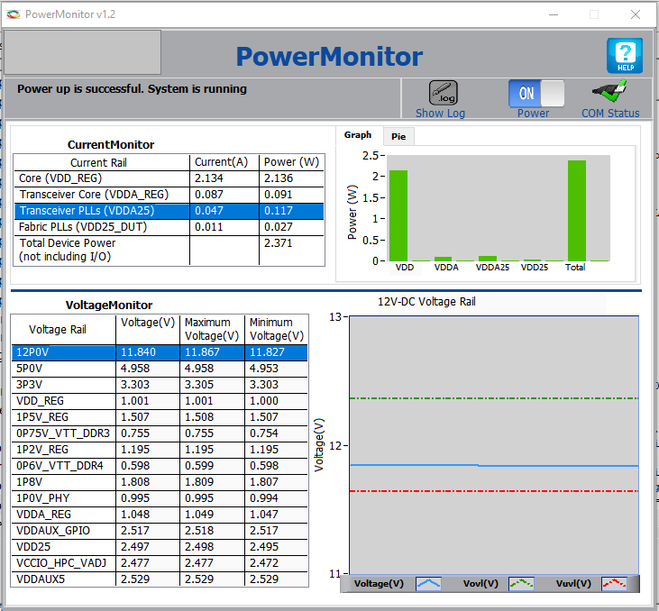 The PowerMonitor application successfully connects to the board and starts displaying the Core Fabric (VDD) power, Fabric PLL (VDD25) power, Transceiver Core (VDDA) power and Transceiver PLL (VDDA25) power.
