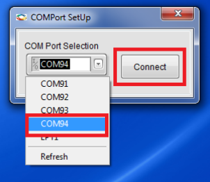 - In the COMPort SetUp dialog box, select the highest COM port from the drop-down and click Connect, as shown in the following figure.