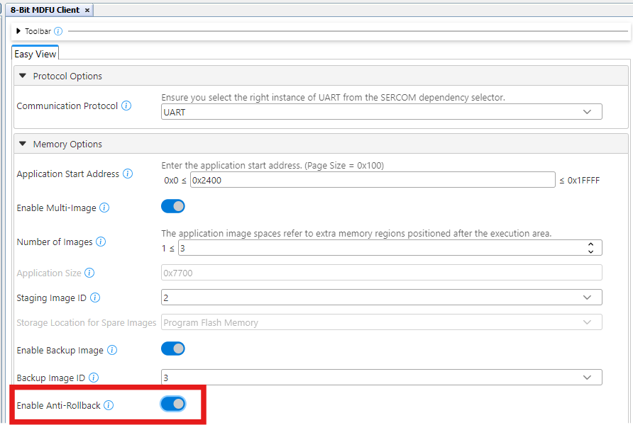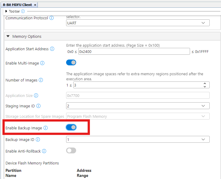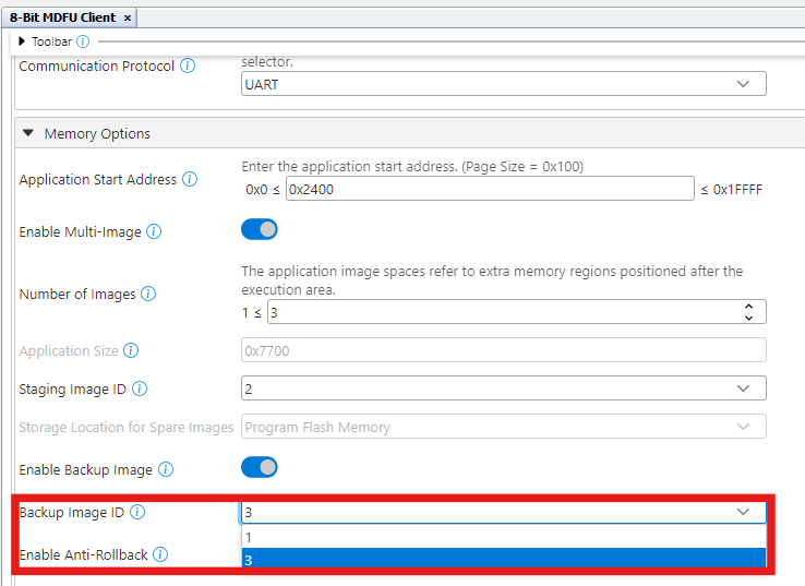 In the 8-Bit MDFU Client User tab, toggle the switch the Enable Multi-Image toggle button on to enable multiple image support.