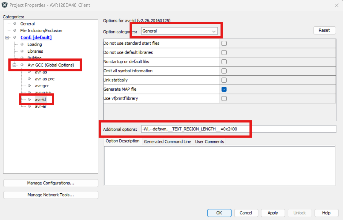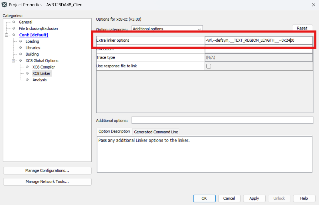 Figure 4-192. AVR XC8 Linker Settings: Open Project Properties>XC8 Global Options>XC8 Linker>Additional Options. In the “Extra linker options” text box, add:-Wl,--defsym,__TEXT_REGION_LENGTH__=<Application Start Address in WORDS>