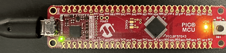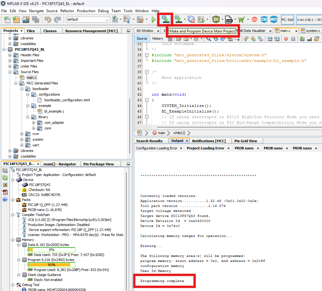 To prepare the chip to bootload, click the Make and Program Device button. After this programming process ends, the LED on the PIC18F57Q43 Curiosity Nano board will remain ON.