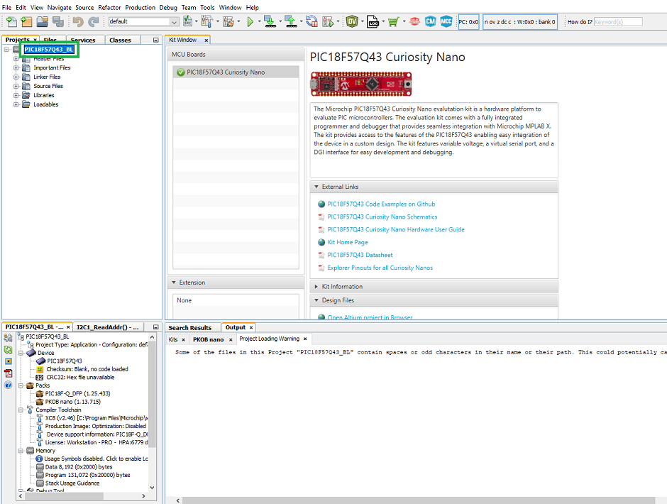 Description: This section details a full multi-image bootloader use case on the PIC18F57Q43 microcontroller, which applies to many variants of the PIC18F family and can also be extrapolated to other 8-bit PIC and AVR chips as well. This example uses the PIC18F57Q43 Curiosity Nano board for demonstration. Refer to the board schematics for configuration information.