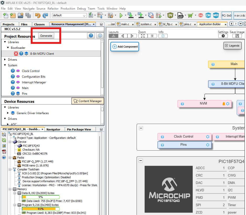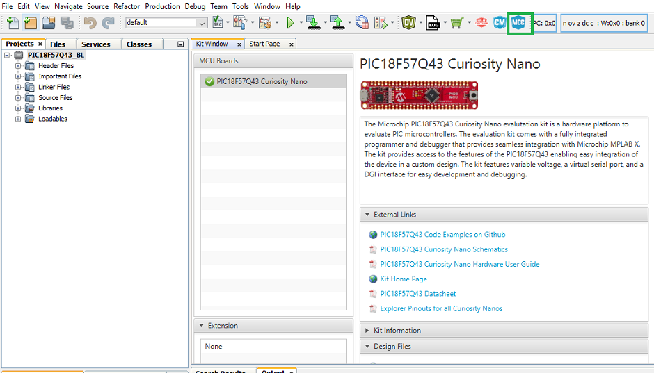 MCC opens up automatically when a new project is created. If not, click the MCC button in the menu bar to start the MPLAB Code Configurator.