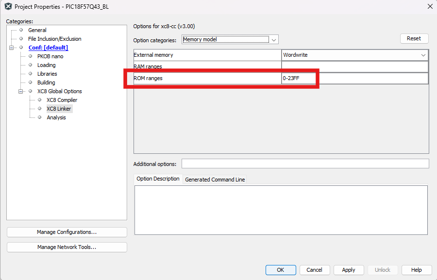 Figure 4-191. Compiler - Linker Settings Open Project Properties>XC8 Global Options>XC8 Linker>Memory Model>ROM ranges. In the “ROM ranges” text box, add:0-23FF