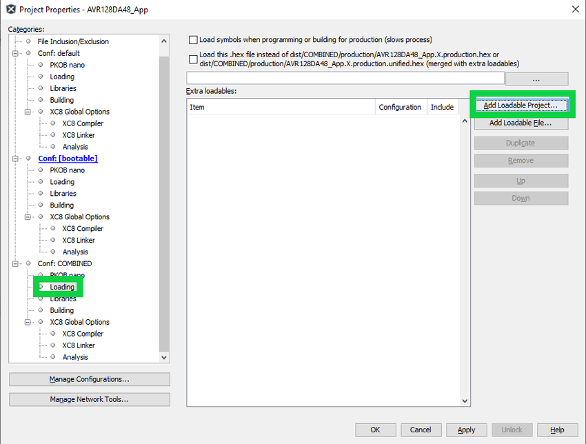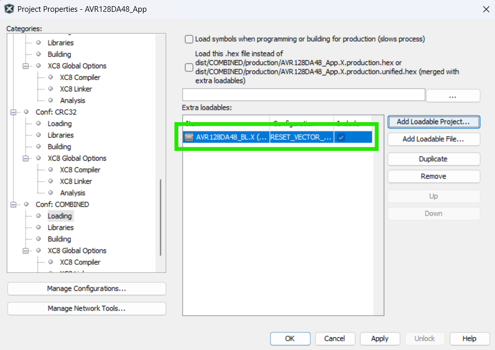 In the COMBINED configuration, navigate to Project Properties>Loading and then click the Add Loadable Project... button.