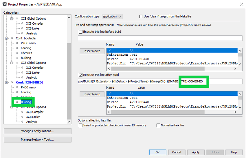 Figure 4-165. Update the Post Build Script Update the post build command from within the new COMBINED configuration by navigating to Project Properties>COMBINED>Building and adding