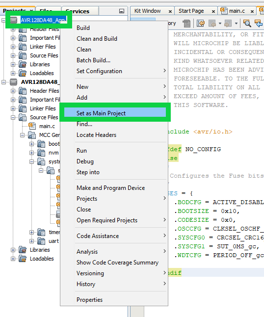 This section demonstrates how to merge the bootloader and application projects into a single hex file for 8-bit AVR® devices.
