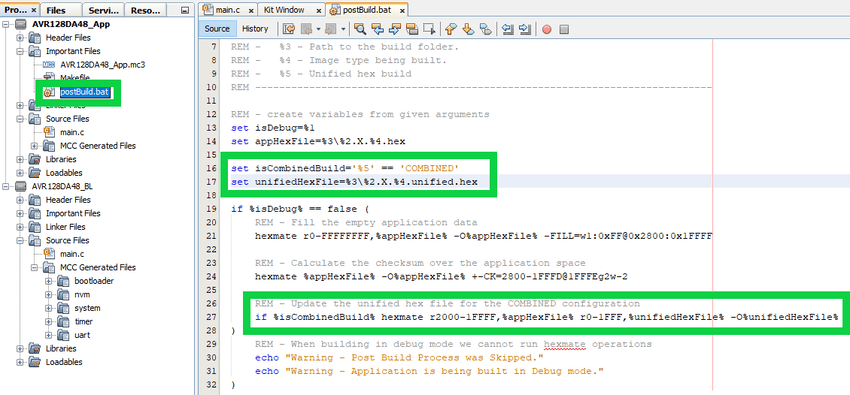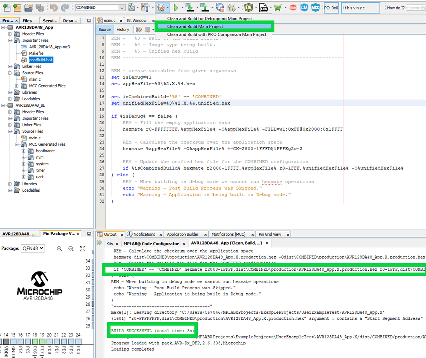 In a production environment, it is common practice to build both the bootloader code and the application code together into a single hex file. This allows both projects to be programmed at the exact same time. This section demonstrates how to combine the bootloader and application projects into a unified hex file using MPLAB X.