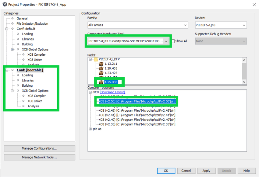 Configure the project properties. Go to File>Project Properties and select PIC18F57Q43 Curiosity Nano under Connected Hardware Tool, DFP version under Packs and the XC8 version under Compiler Toolchain.