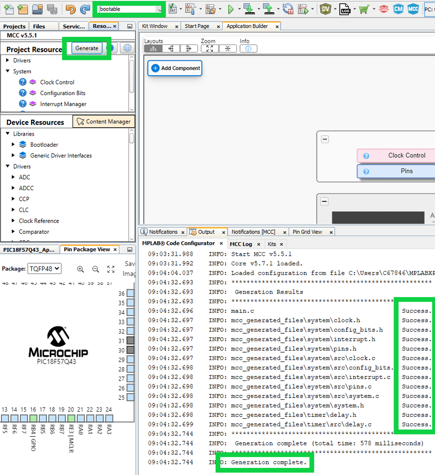 Important: Make sure to match the Clock Control and Configuration Bits settings to the bootloader project settings.Figure 4-47. Generate Application Code -