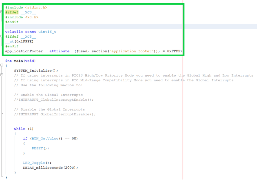 header file must also be included in the main file.// if the BTN is pressed, reset the device. if (BTN_GetValue() == 0U) { RESET(); } LED_Toggle(); DELAY_milliseconds(200U);