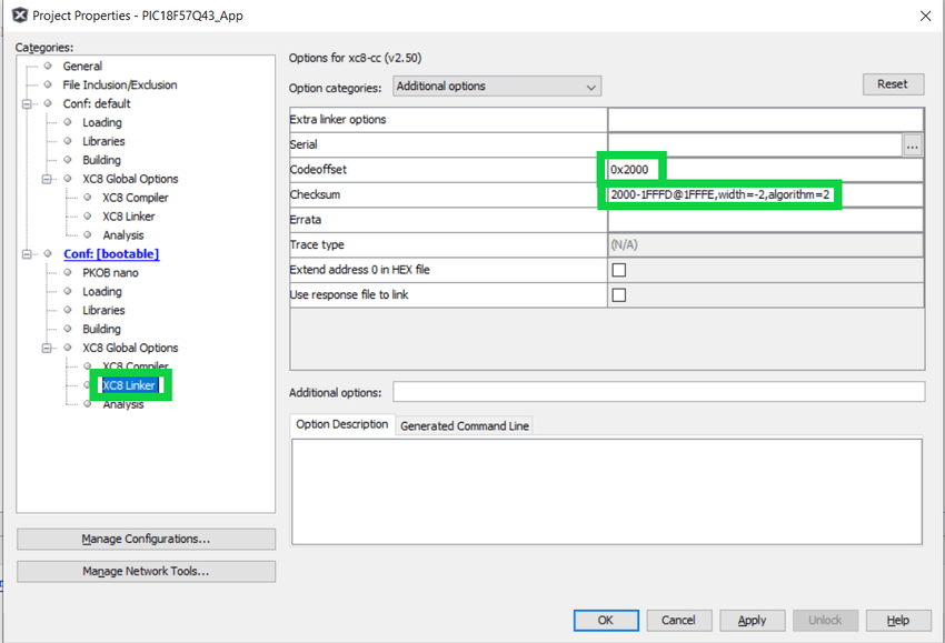 The following section is intended to provide an explanation of the compiler and linker settings utilized in the PIC18F57Q43 end application project. The example below uses the Checksum verification scheme for demonstration.