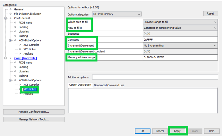 Open File>Project Properties. Add the below settings to the XC8 Linker>Fill Flash Memory. These steps enable the mentioned constant to fill all the unused memory space in the generated hex file. Set the Memory address range to: