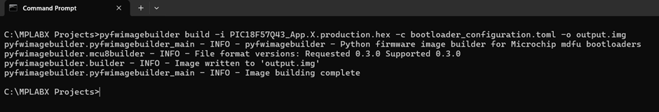 pyfwimagebuilder build -i PIC18F57Q43_App.X.production.hex -c bootloader_configuration.toml -o output.img