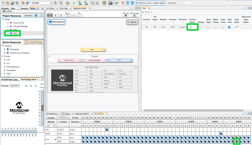 Configure the on-board LED by setting the RF3 pin. Set the Custom Name to LED.