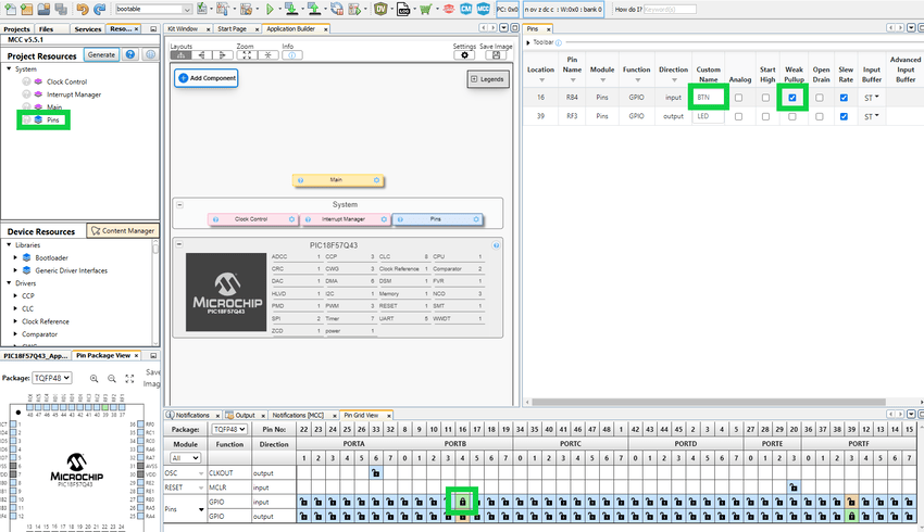 Configure the on-board Switch by setting the RB4 pin. Set the Custom Name to BTN and enable Weak Pull-ups.