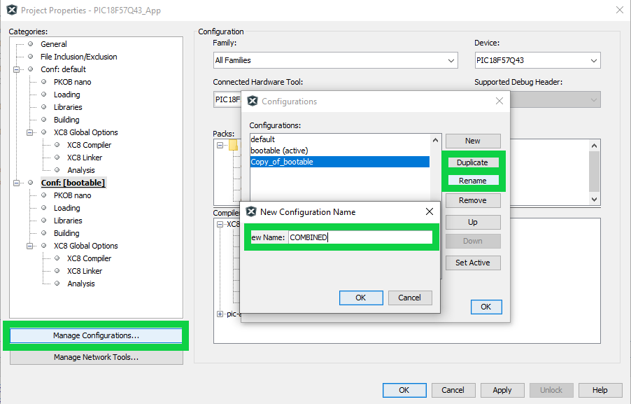 Navigate to Project Properties>Manage Configurations.... Click Duplicate with the bootable configuration selected and then Rename the resulting copy to ‘COMBINED’. Then click OK and OK again.
