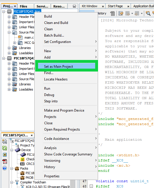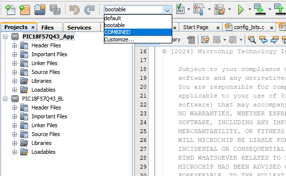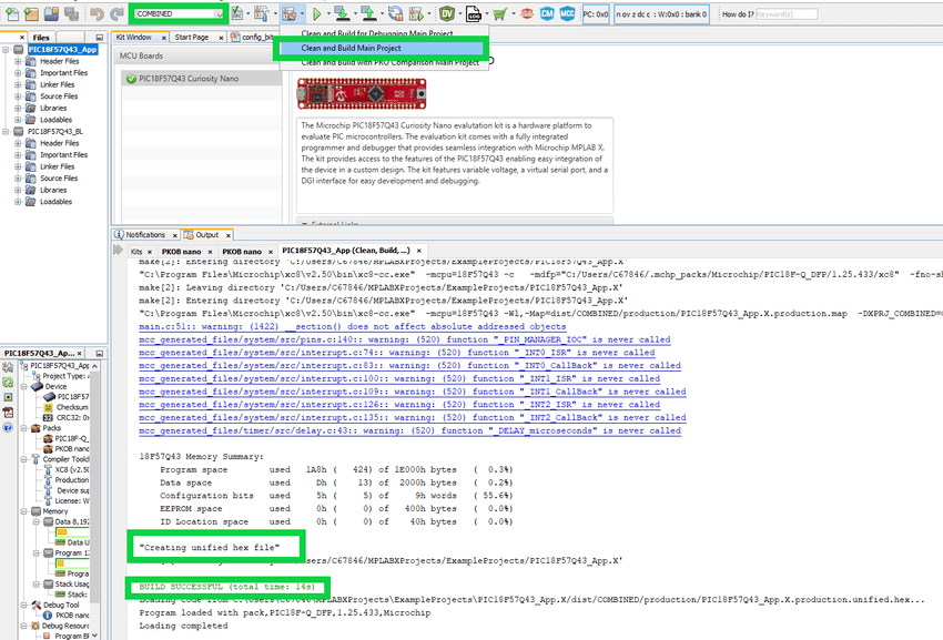 In a production environment, it is common practice to build both the bootloader code an the application code together into a single hex file. This allows both projects to be programmed at the exact same time. This section demonstrates how to combine the bootloader and application projects into a unified hex file using MPLAB X.