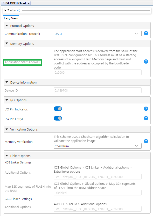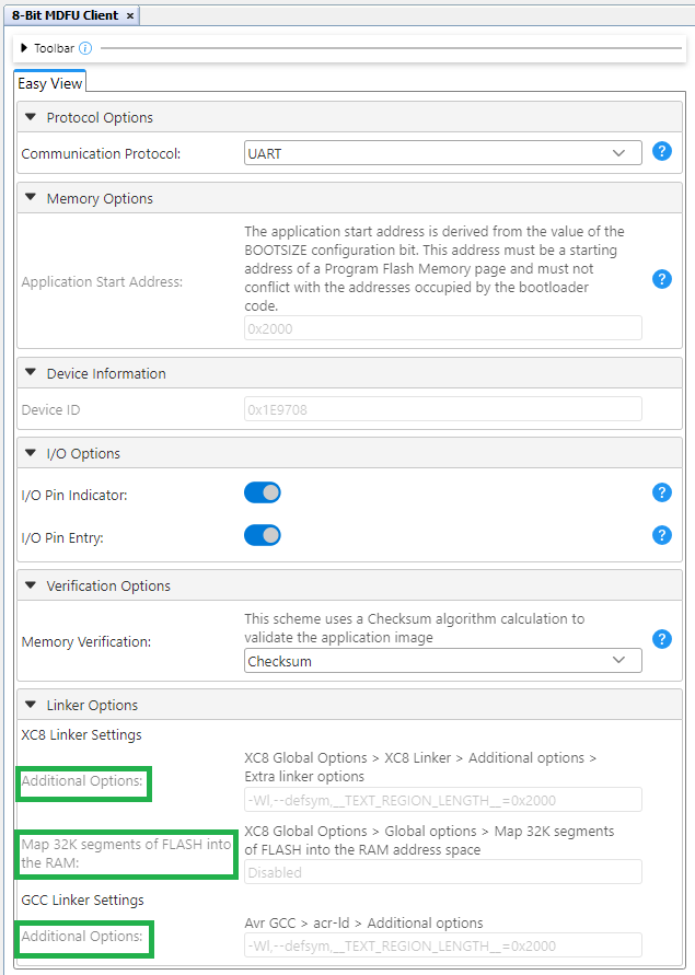 Note: Make sure to uncheck “Map 32K segments of FLASH into the RAM address space” under the Project Project>XC8 Global Options>Global Options, if available, to make sure that the const data is written into Flash memory.Figure 4-129. 8-Bit MDFU Client - Additional Options Figure 4-130. XC8 Compiler - Linker Settings Figure 4-131. GCC Compiler - Linker Settings -