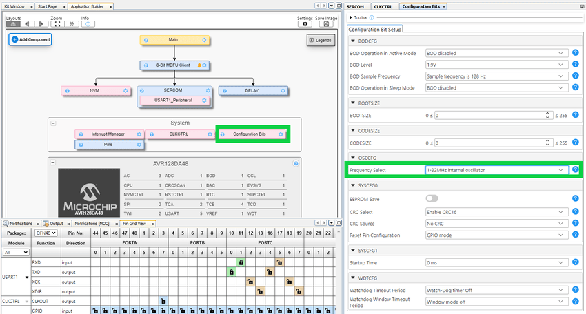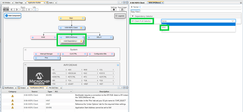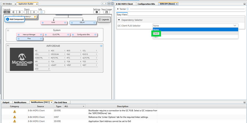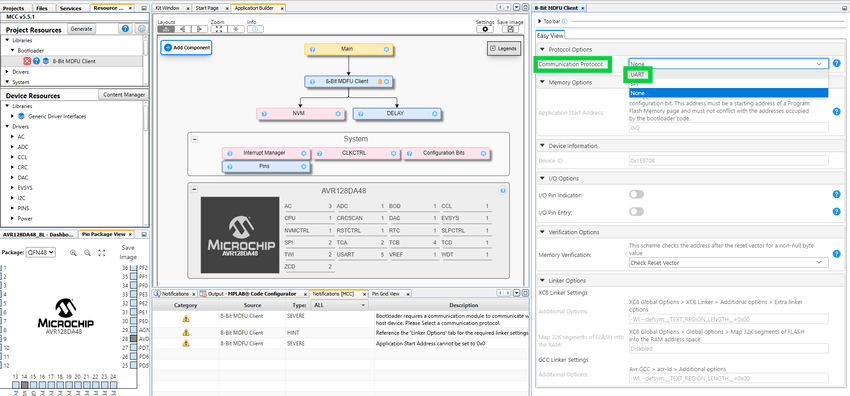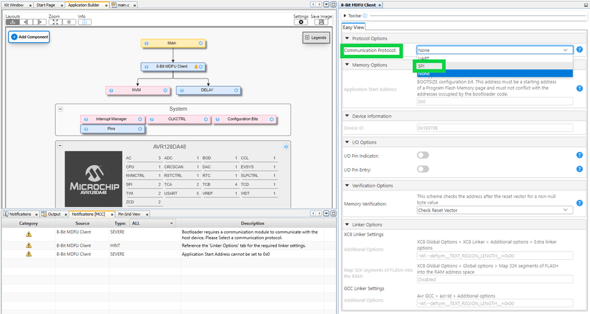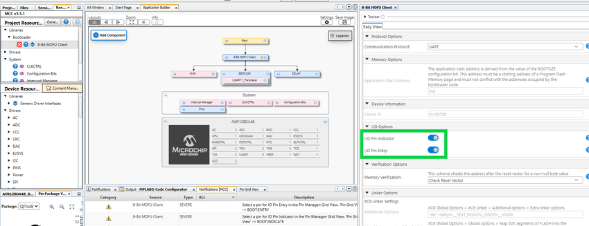 Note: Ignore the notifications for the application start address and linker settings for now.Figure 4-118. Notification [MCC] Tab - For AVR devices, setting the