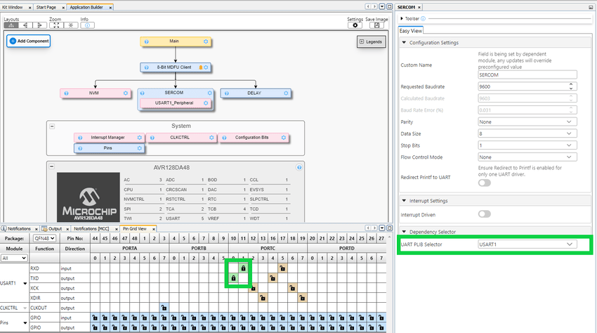 Figure 4-100. Serial/CDC Port A communication driver version that communicates through the PC0 and PC1 pins is needed. For the AVR128DA48 Curiosity Nano, attach the USART1 driver, since that is the UART driver that can communicate through those pins. Select USART1 from the “UART PLIB Selector” in the SERCOM(None) tab. The rest of the SERCOM settings will become visible.