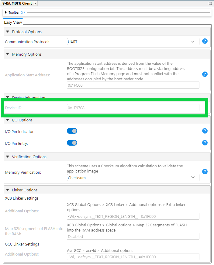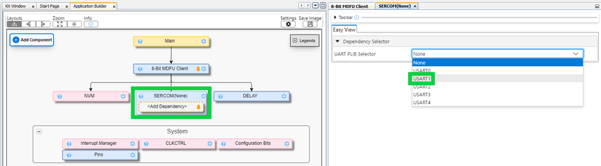 Select UART from the Communication Protocol drop-down list in the 8-Bit MDFU Client Easy View tab.